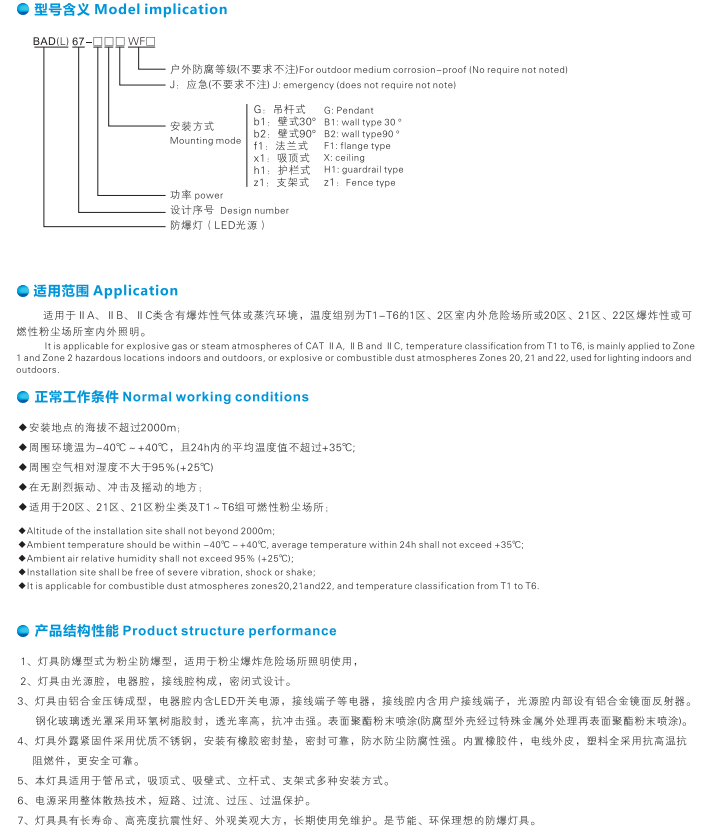 1.灯具防爆形式为粉尘防爆型,适用于粉尘爆炸危险场所照明使用,   2.灯具由光源腔,电器腔构成,密闭式设计。壳体采用铝合金压铸成型,电器腔内含LED开关 电源,接线端子等电器,接线腔内含用户接线端子,光源腔内部设有铝合金镜面反射器。钢化玻璃透光罩采用环氧树脂胶封,透光率高,抗冲击力强。表面聚酯粉末喷涂。(防腐型外壳经过特殊处理后再表面喷涂)。   3.灯具外露紧固件采用不锈钢,安装有橡胶密封垫,密封可靠,内置橡胶件,电线外皮,塑料全采用抗高温抗阻燃件,更可靠。   4.电源采用整体散热技术,短路,过流,过压,过温保护。适用于管吊式,吸顶式,吸壁式,立杆式,支架式等多种安装方式。   5.本灯具寿命长,高亮度抗震性能好,外形美观大方。是节能,环保理想的防爆灯具。